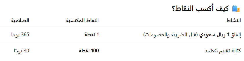 جميع النقاط المكتسبة، سواء من الطلبات أو التقييمات، صالحة لمدة 365 يومًا من تاريخ إضافتها.